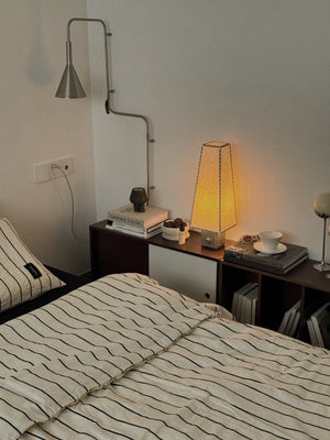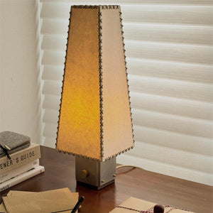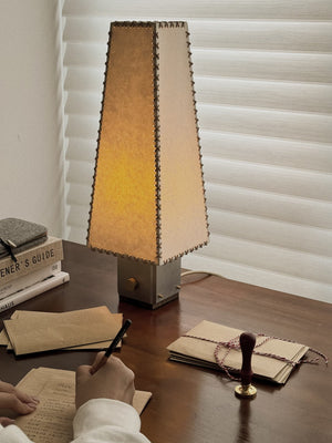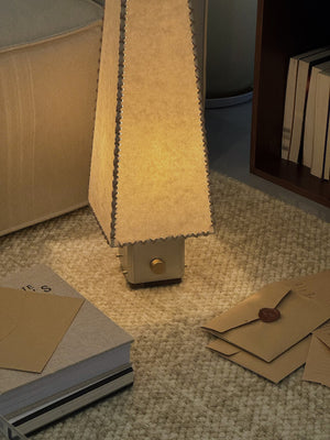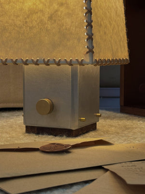 The Parchment Lamp evokes the warmth of handwritten letters with its nostalgic and romantic design. Featuring a handcrafted lampshade made from parchment paper, stitched together with leather thread for a tactile, bookbinding-inspired detail. Its vintage aluminum base complements the delicate shade, creating a harmonious blend of strength and softness. Perfect for adding understated elegance to your space.